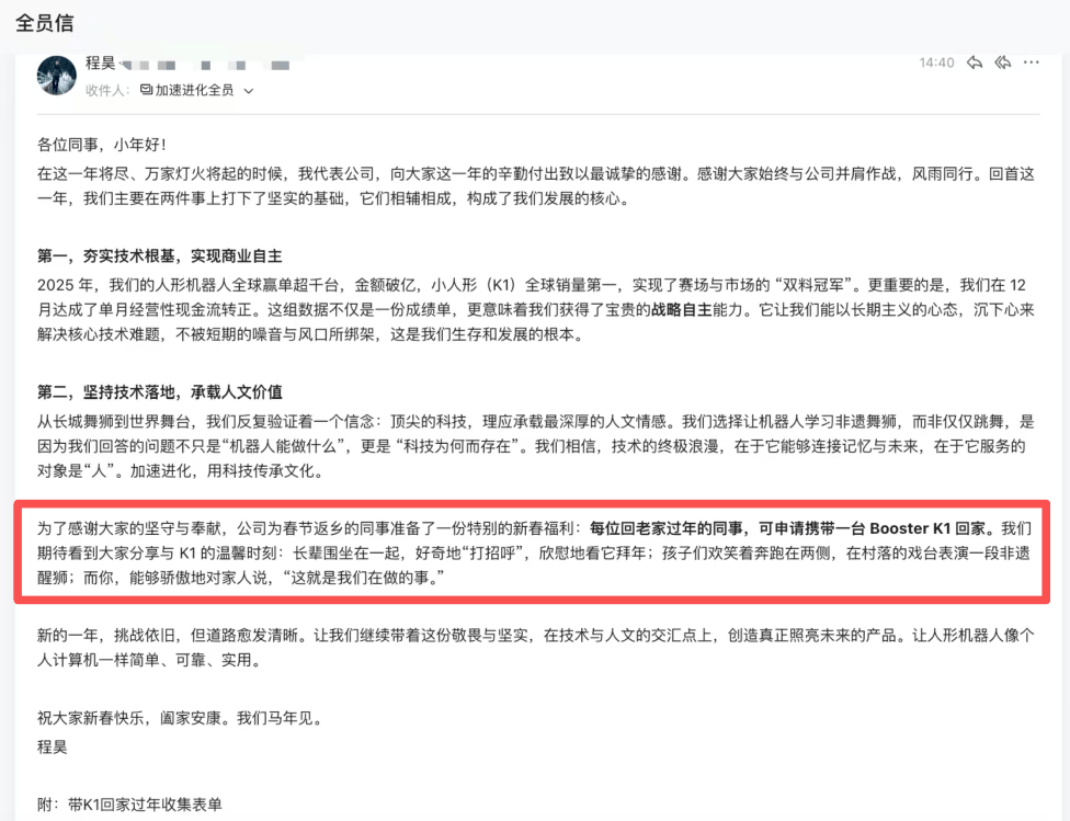 也正因如此,春节返乡的员工们有了一项特别的福利——可以申请携带一台Booster K1回家过年!