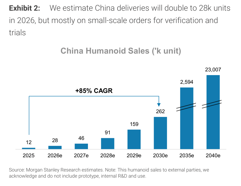 根据摩根士丹利的预测,2026年仅中国市场出货量就将达到2.8万台,此后逐年翻倍,2040年突破千万台。
